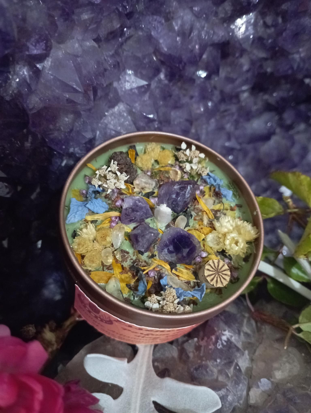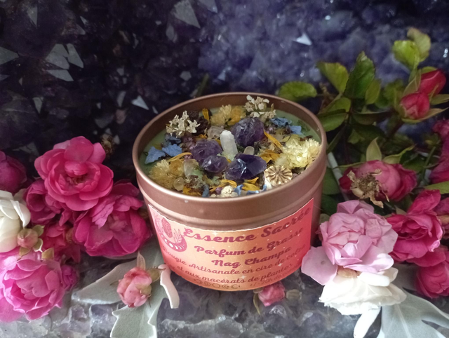 Bougie parfumée réalisée en cire de colza au parfum de Grasse Nag Champa, garantie sans CMR ni phtalates .cette cire est 100 % biodégradable, végétale et naturelle, garantie sans OGM; j' y ajoute un colorant vert écologique et naturel, fabriqué à base de polymère de végétaux Contient 80 grammes de cire pour environ 20 heures de combustion; la mêche est en coton et cirée à la main Pyramide olfactive : Notes olfactives : Floral, oriental Notes de tête : Pomme, fruits rouges, rose Notes de coeur : Accord floral, patchouli Notes de fond : Musc, fève tonka, vanille Cristaux Fleurs séchées issues de mon jardin ou de cueillette Les décors de fleurs peuvent varier en fonction des saisons et de mon stock, la couleur peut sensiblement varier. La bougie est accompagnée d’ une notice avec des précautions d’emploi et d’utilisation, il est important de s’y référer afin d'en profiter pleinement. Chaque bougie est réalisée avec le plus grand soin Le délai de fabrication peut prendre entre 1 et 4 jours
