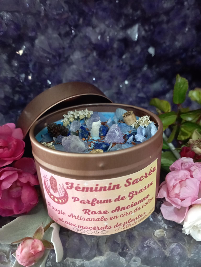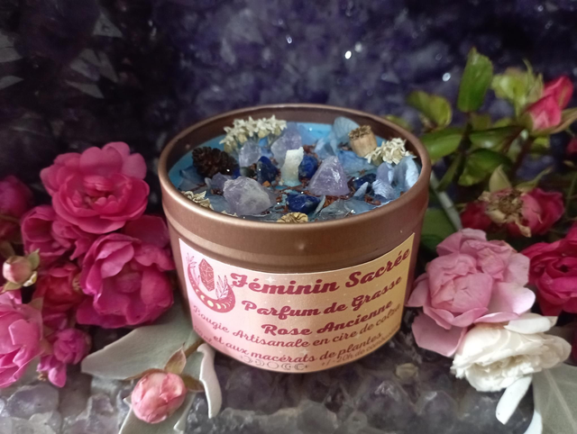 Cette bougie parfumée est une invitation à honorer son principe Féminin sacrée à travers les effluves qu'elle transportent, à se reconnecter à ses intuitions profondes, à un amour subtil et délicat à la fois.Elle accompagnera vos séances de méditation. Bougie réalisée en cire de colza au parfum de Grasse à la Rose Ancienne , garantie sans CMR ni phtalates .Cette cire est 100 % biodégradable, végétale et naturelle, garantie sans OGM,j'y ajoute un colorant bleu naturel et écologique. Contient 80 grammes de cire pour environ 20 heures de combustion la mêche est en coton et cirée à la main Pyramide olfactive : Notes olfactives : Floral Notes de tête : Magnolia, violette Notes de coeur : Rose, musc Notes de fond : Cèdre, bois de cashmere Cristaux Fleurs séchées issues de mon jardin ou de cueillette sauvage Les décors de fleurs peuvent varier en fonction des saisons et de mon stock, la couleur peut sensiblement varier. Le délai de fabrication peut prendre entre 1 et 4 jours