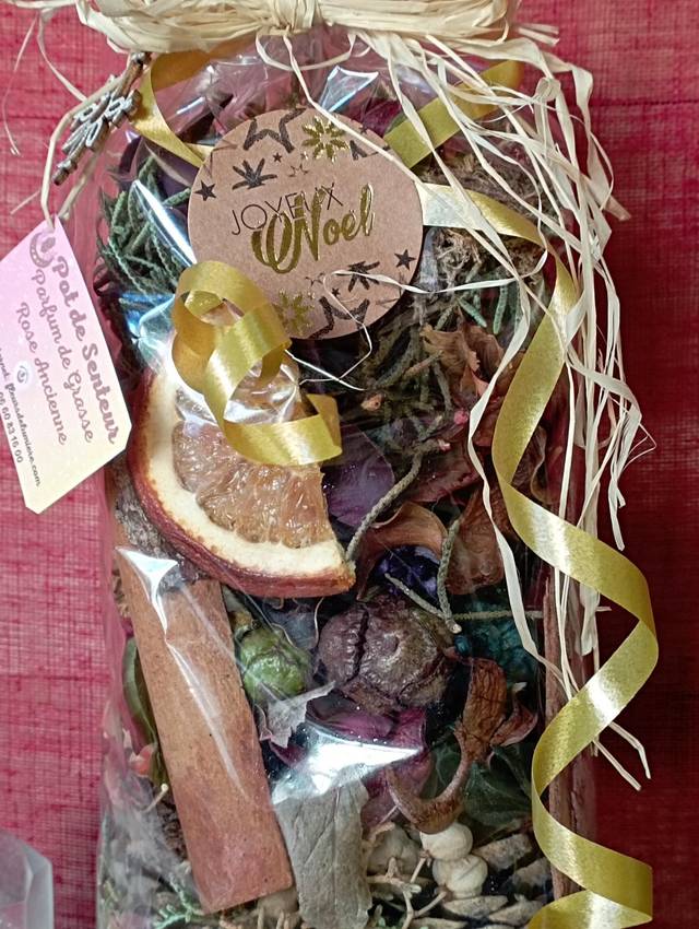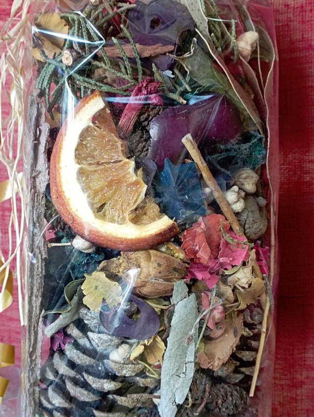 Vous y trouverez à l'intérieur un mélange de plantes issues de mes cueillettes sauvages, de la cannelle, des oranges séchées au feu de bois ainsi que d'anciens pot pourri de récup qu'il me tenait à coeur de recycler tant leur couleurs sont belles et éclatantes.