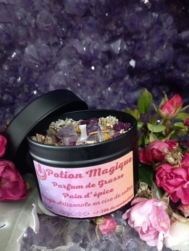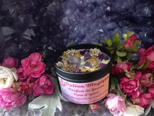 Bougie parfumée réalisée en cire de colza au parfum de Grasse Pain d'épice, garantie sans CMR ni phtalates .cette cire est 100 % biodégradable, végétale et naturelle, garantie sans OGM. Contient 80 grammes de cire pour environ 20 heures de combustion la mêche est en coton et cirée à la main Pyramide olfactive : Notes olfactives : gourmand, épicé Notes de tête : orange, caramel, cumin Notes de coeur : vanille, girofle, miel Notes de fond : cannelle, patchouli, fêve tonka Cristaux Fleurs séchées issues de mon jardin ou de cueillette sauvage Les décors de fleurs peuvent varier en fonction des saisons et de mon stock. La bougie est accompagnée d’une notice avec des précautions d’emploi et d’utilisation, il est important de s’y référer afin d'en profiter pleinement Délai de fabrication entre 1 et 4 jours Taille du pot: hauteur avec couvercle: 4,8 cm, diamètre: 6 cm