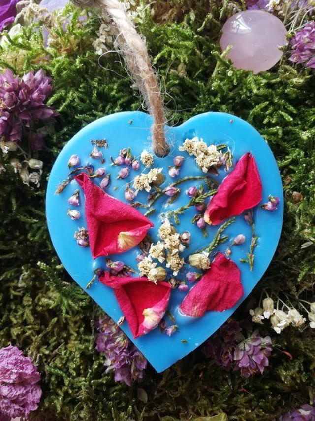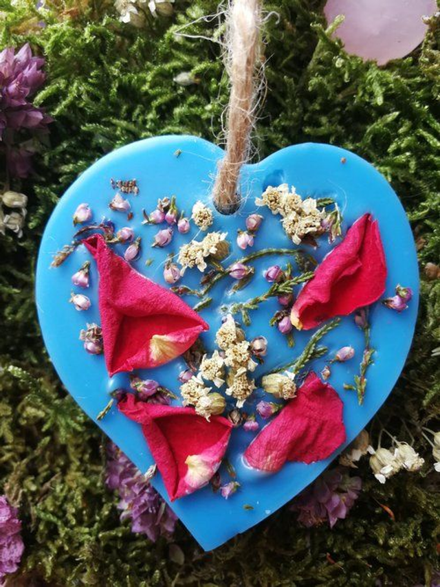 Suspension parfumée à l’huile essentielle de Jasmin, à suspendre où à déposer dans vos armoires, tiroirs, penderie, petits espaces, dans votre linge… Elle sont décorées avec des fleurs issues de cueillette sauvage ou de mon jardin et sont réalisées a base de cire de colza 100% végétale, biodégradable.J’ y ajoute un colorant bleu entièrement naturel écologique et non toxique fabriqué à base de polymère de végétaux.Elles diffuseront leur parfum durant environ 2 à 3 mois et lorsqu’elles auront fini d’émaner leurs senteurs, vous pourrez les réutiliser en les coupant et en les déposant dans un brûle parfum.